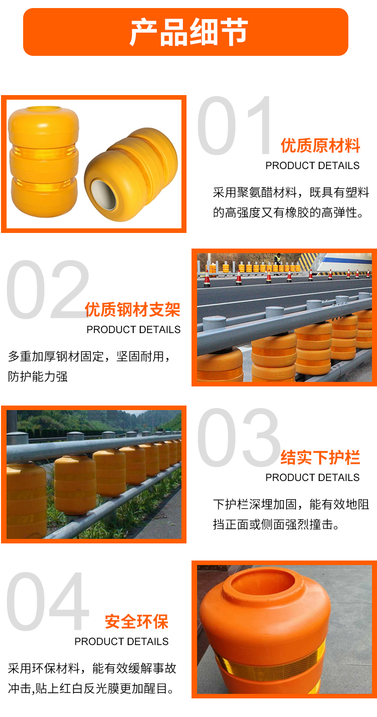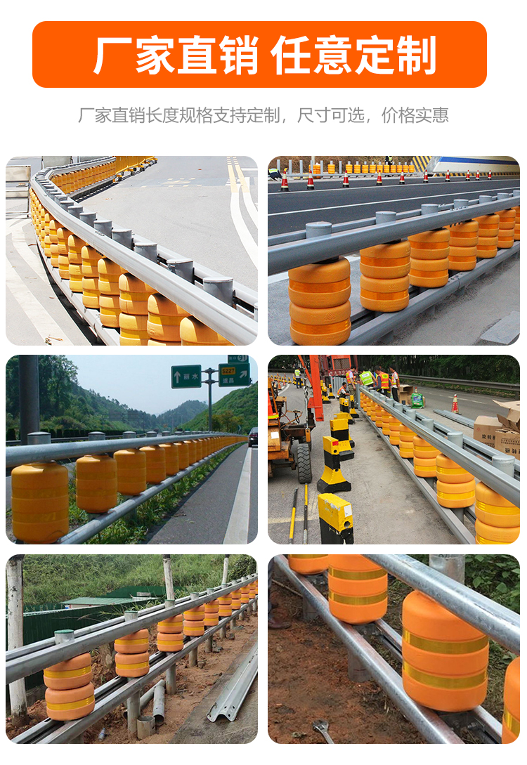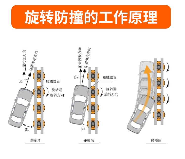 當車輛撞上護欄時,旋轉桶自身的旋轉功能和桶身的良好回彈性,可以大大減少車輛和駕乘人員的受傷害程度,起到良好的保護作用。