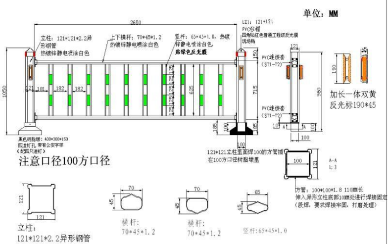 3、阻攔功能:交通護欄將阻攔不良的交通行為,阻攔試圖橫穿馬路的行人或自行車或機動車輛。它要求護欄有一定的高度,一定的密度(指豎欄),還要有一定的強度。