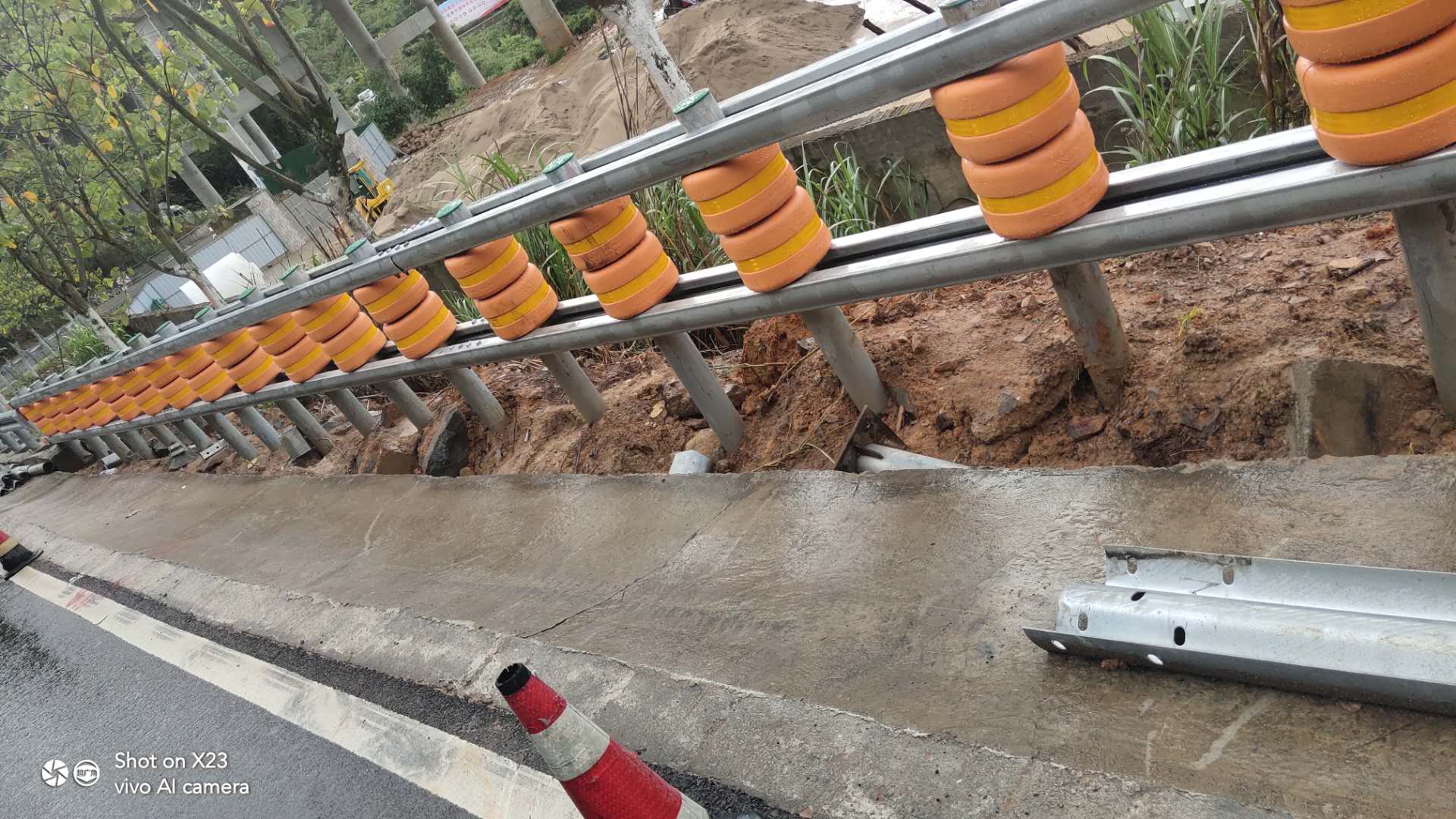 2. The columns are separated by 1 meter or 0.7 meters, and two rotating barrels are installed on each column. The rotating barrel is made of EVA (ethylene-vinyl acetate copolymer) as the main material, added with 17 kinds of auxiliary materials such as PE (polyethylene) and related chemical additives, and is produced under a certain temperature and pressure, and has extremely high flexibility. It has high thermal resistance and high temperature resistance, and can continue to work at temperatures between -60°C and 70°C. This type of guardrail is usually installed at the ramp of the highway, continuous downhill and bends.